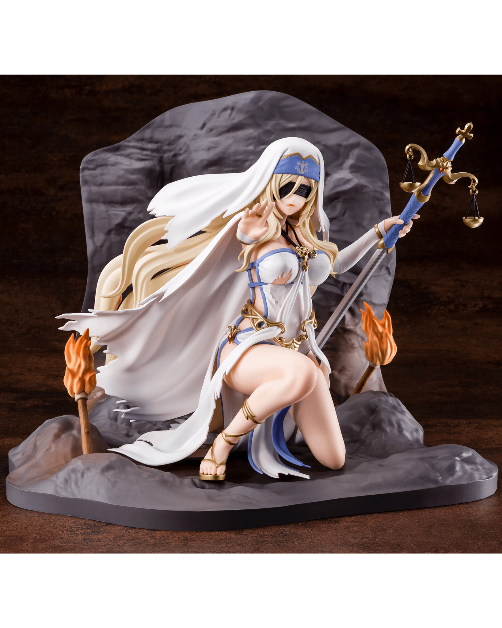 The Sword Maiden from "Goblin Slayer II" is now a fantastic figure from Hakoiri Musume! This figure plunges you into a harrowing scene with the Sword Maiden surrounded by goblins inside a cave that serves as their nest. The Sword Maiden's defiant stance, with a sword clutched in one hand, emphasizes the soft skin visible through the gaps in her outfit; her rocky base is insanely detailed too, to bring you directly into her world! She can be displayed with or without her head scarf, and her skirt and cloak can also be removed.