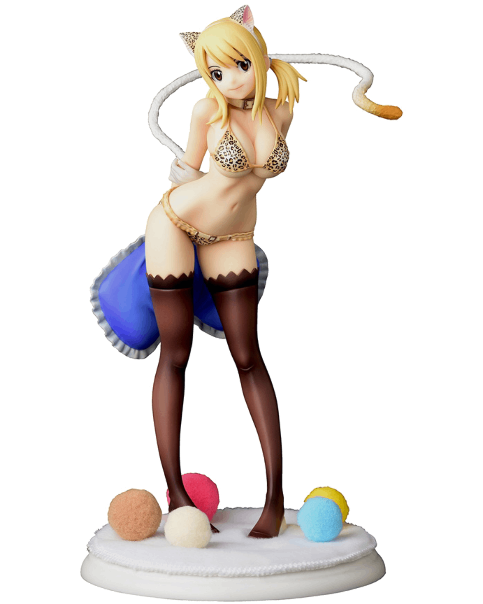 Lucy Heartfilia from "FAIRY TAIL" poses in a leopard-print cat outfit just for you! She's got a big, soft heart cushion held in one hand, as well as a cute smile -- check out that gorgeous body line, too! Her base is included, as is a piece of soft fabric to place atop the base for her to stand on, and a soft fur ball too (the fur ball is a randomly chosen color). Order her for your own collection today!