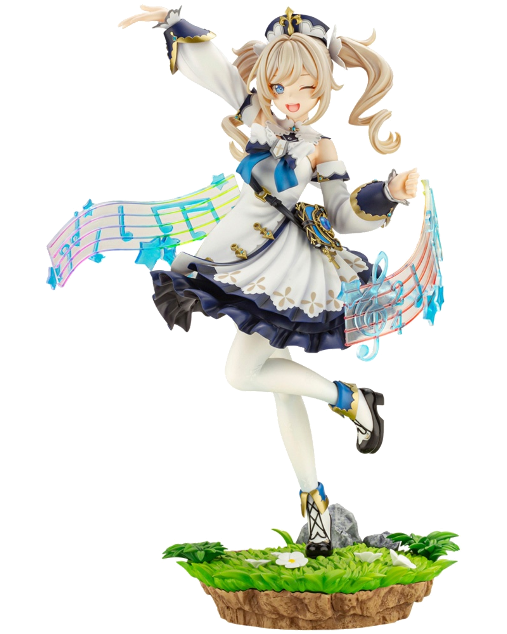 Genshin Impact's adorable healer Barbara is now an equally as cute 1/7 scale figure! She's come to life in figure form summoning her 'Let the Show Begin' skill; musical notes aflutter around her in fun and extravagant detail! But these semi-clear parts can also be removed, if you so wish, allowing for you to have her stand-alone in her cutesy pose.