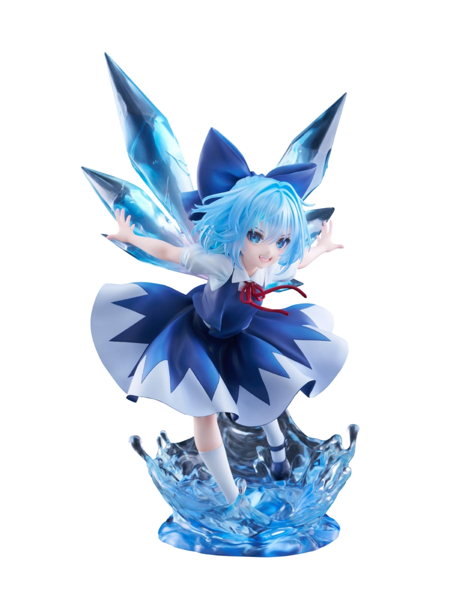 This figure of Cirno from "Touhou Project" is based on an illustration by the popular artist Uuuzan! Cirno's ice wings are painted with pearlescent paint and gradation to reproduce their crystalline form; their solidity gives them a sense of weight and volume, and the wet texture is expressed through the sculpting and coloring. You'll love the wide variety of colors you'll be able to see when you change your viewing angle, and the vivid splash effect of her base, too.