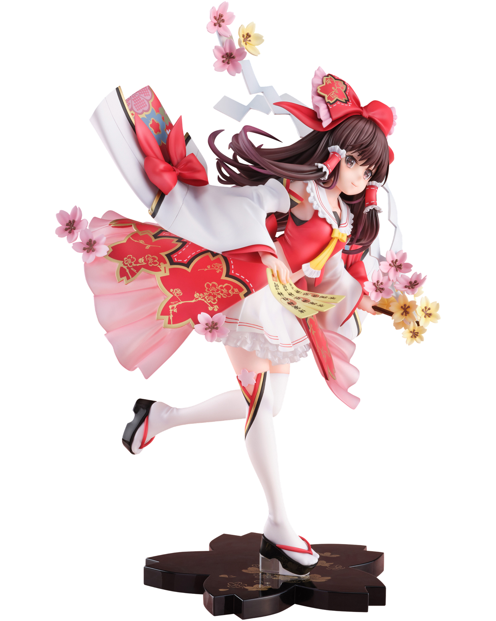 Reimu Hakurei from "Touhou Project" is now a figure from FuRyu, based on an illustration by Fuzichoco! The shrine maiden of Hakurei Shrine runs along with a branch of blossoming sakura flowers in one hand and several ofuda in the other. Her extravagant outfit includes traditional Japanese-design prints, huge bows, and a cute ruffled miniskirt! Her base resembles a sakura flower too.