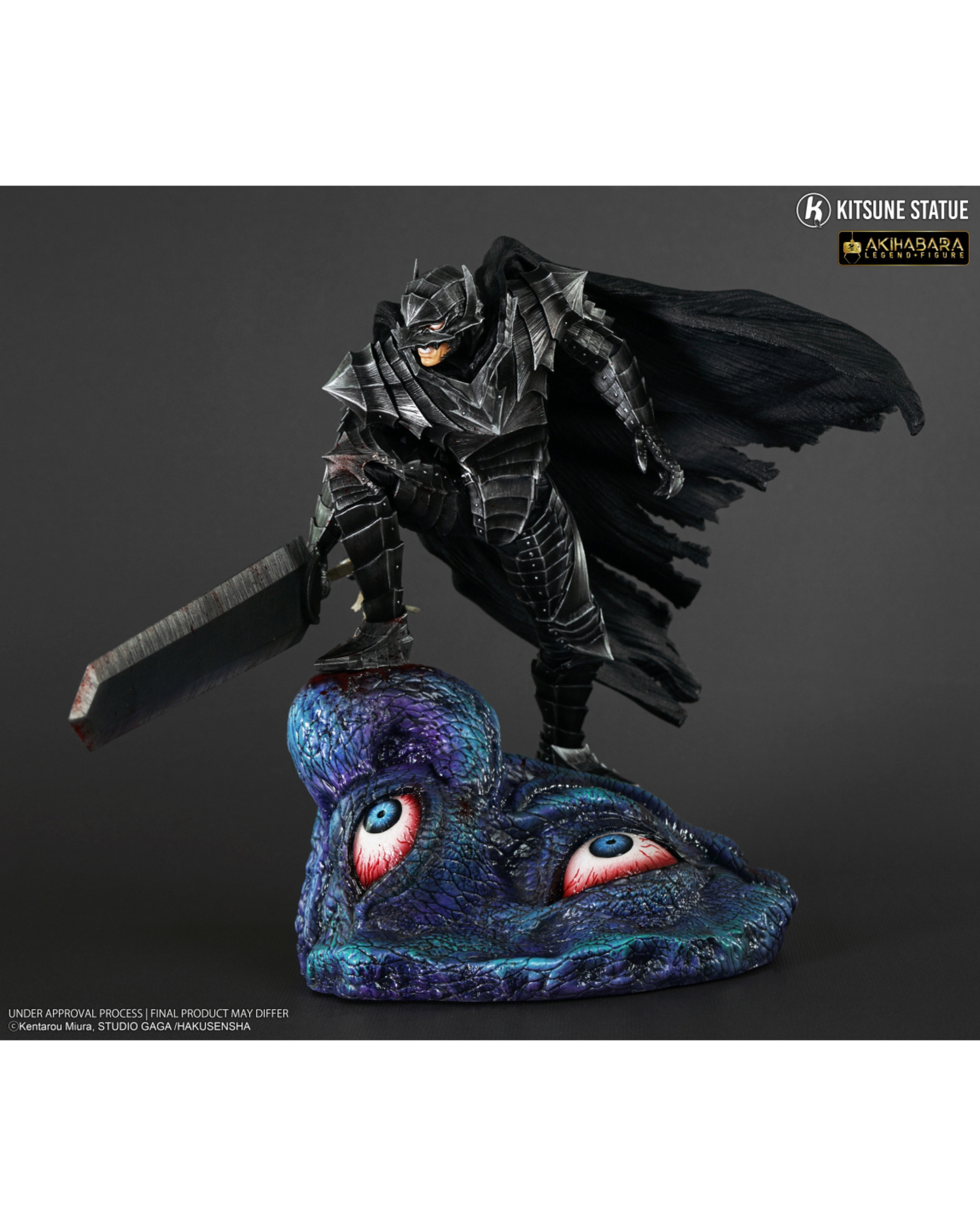 Pure Arts brings us a truly amazing figure of Guts from "Berserk" wearing his Berserker armor! He pauses atop an ominous-looking base with a terrifying snarl on his face, holding the immense Dragon Slayer sword with great ease. This astonishing figure is loaded with detail, like the heavy texture of the armor, the weathered and bloody appearance of the Dragon Slayer's blade, and each grotesque scale of the creature that makes up the base.